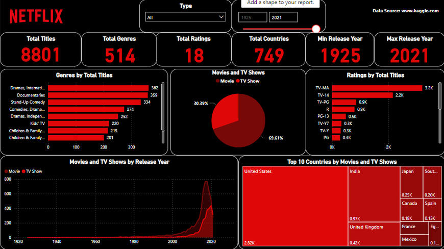 Netflix's Dashborad is a data set was created to list all shows available on Netflix streaming, and analyze the data to find interesting facts. This data was acquired in July 2022 containing data available in the United States.